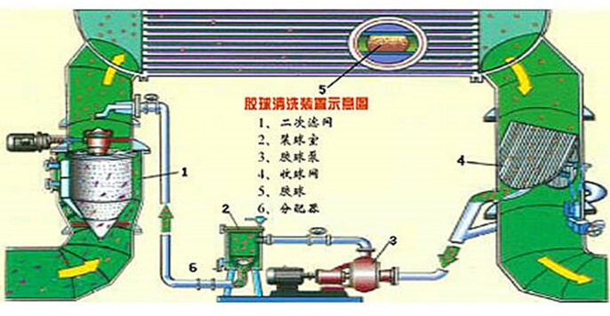 1、二次濾網(wǎng) 2、收球網(wǎng) 3、裝球室 4、膠球泵 5、分匯器 6、控制柜 7、閥門(mén)和管路。